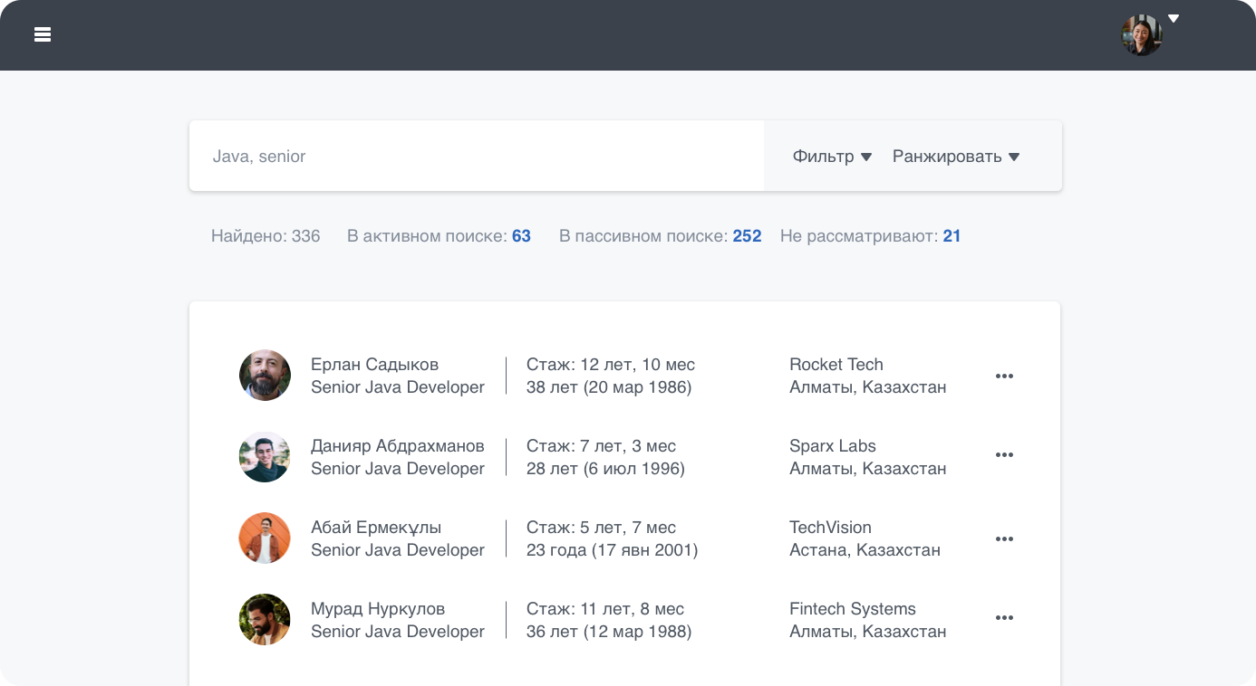 AI-алгоритмы сегментируют и ранжируют кандидатов по стеку, грейду, результатам технических тестов и другим важным критериям.