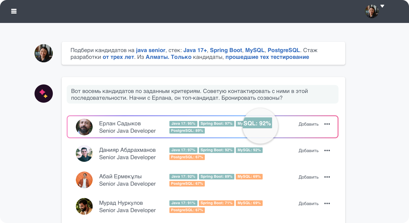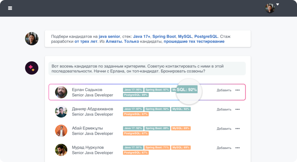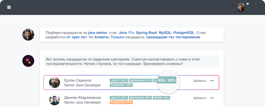 AI-ассистент передает IT-рекрутеру только подходящих под запрос кандидатов, для контакта. Повышая скорость и эффективность этапа скрининга.
