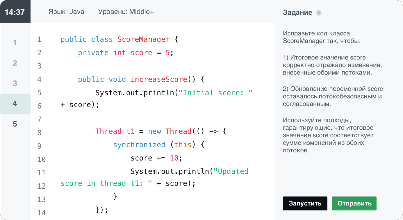 Оценка автоматизирована за счет юнит-тестов, а также простых и сложных тестовых кейсов, оценивающих корректность и эффективность решений. Дополнительные функции прокторинга и антиплагиата обеспечивают объективность этапа тестирования.